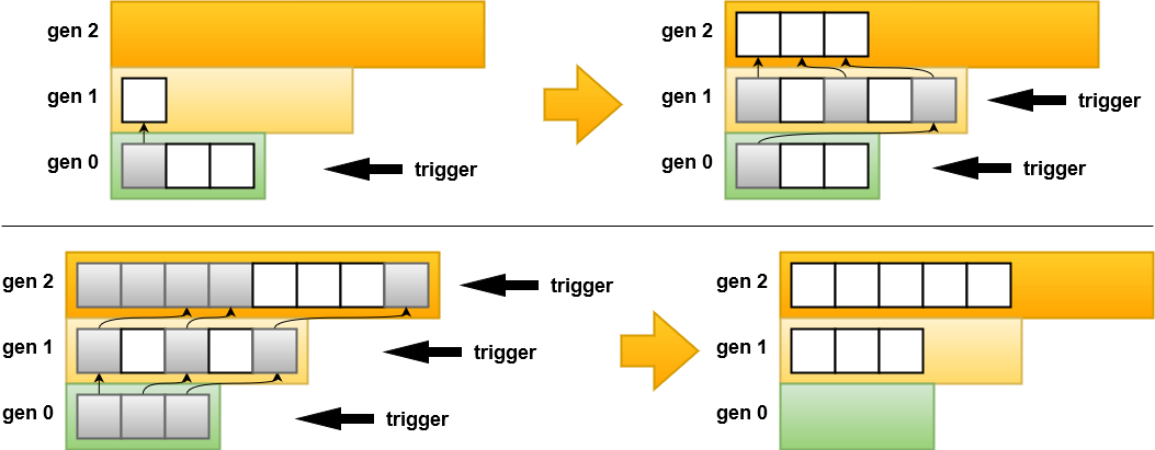 - Al iniciarse un ciclo se realiza sobre gen 0, y los objetos sobrevivientes se promueven a gen 1. Si el trigger continúa sobre gen 1 se recolecta de igual forma