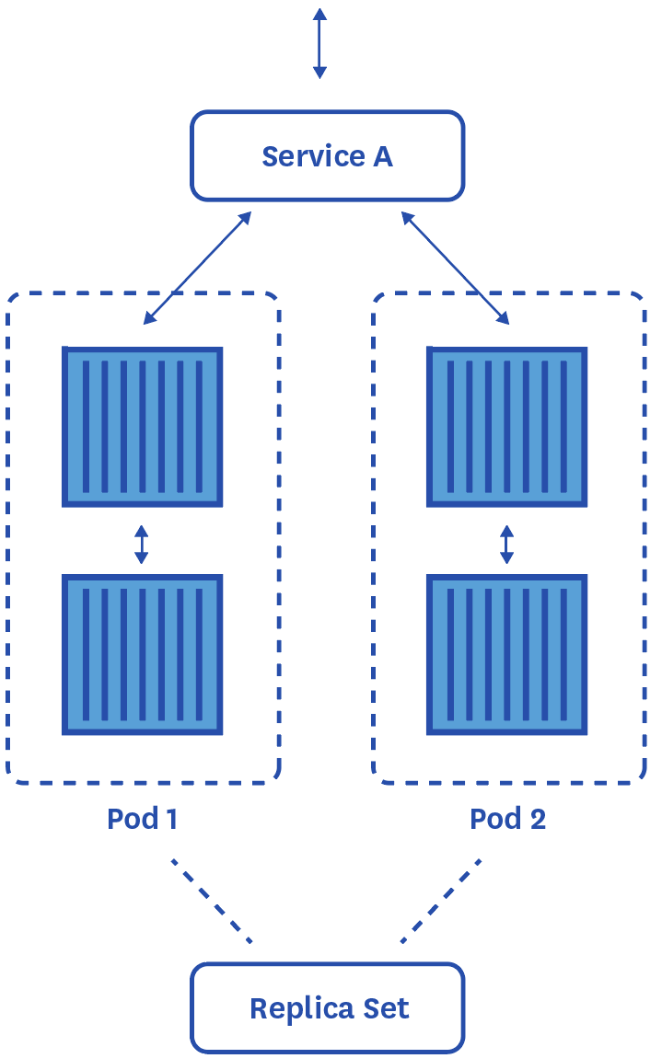 Desacopla as definições de trabalho dos pods. Os proxies de serviço do Kubernetes automaticamente levam as solicitações de serviço para o pod correto, independentemente do local do pod no cluster ou se foi substituído