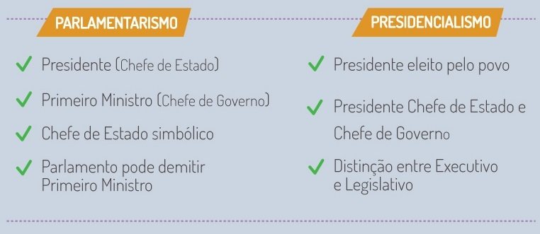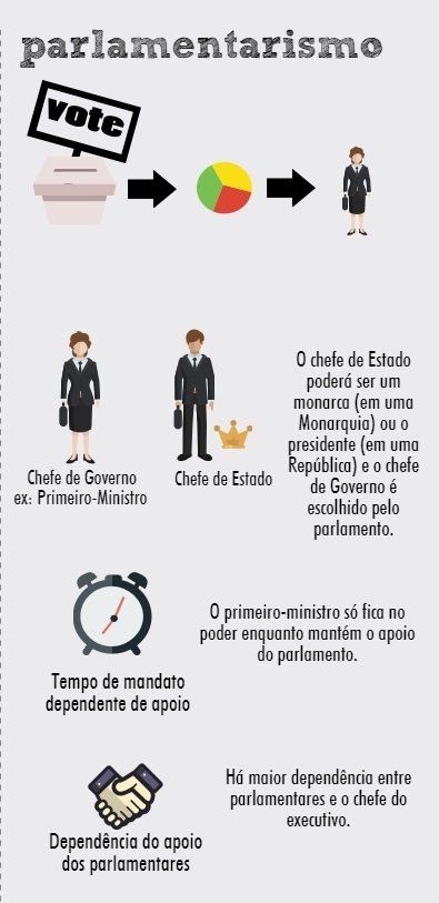 Parlamentarismo - É um sistema de governo no qual o poder executivo age em conjunto com o legislativo através do parlamento. O Chefe de governo (Primeiro Ministro; Chanceler) e Chefe de estado são indivíduos diferentes