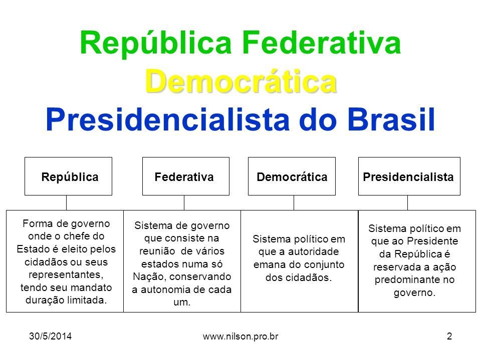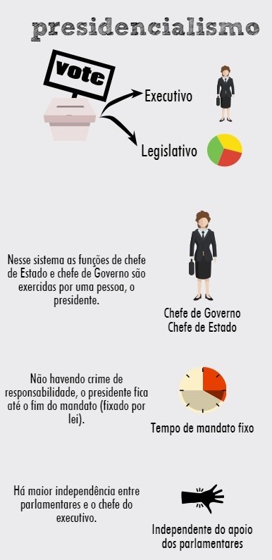 Presidencialismo - O chefe de poder e chefe de estado são a mesma pessoa, presidente, que é elegida pelo voto popular. Ou seja, a prerrogativa de representação e governança cabe ao presidente. O executivo e o legislativo são independentes entre si.