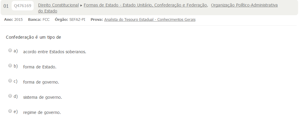 Confederação - Assim como a federação, é a união de estados em prol de um objetivo, só que esses estados possuem total soberania. São equiparados a uniões internacionais.