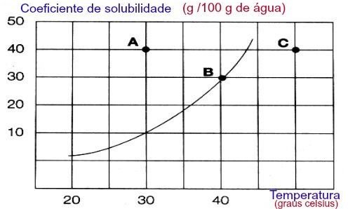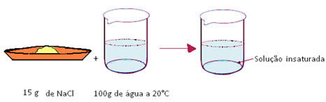 Por exemplo, se dissolvermos apenas 15 g de sal em 100 g de água a 20ºC, teremos uma solução insaturada, pois ainda faltam 21 g para atingir a quantidade máxima de soluto a ser dissolvido nessas condições.