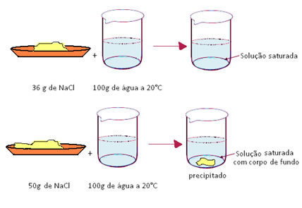 Se misturarmos 50g de sal em 100 g de água a 20ºC, veremos que os 36g irão se dissolver e o restante (14g) irá precipitar, formando corpo de fundo. Nesse caso teremos então uma solução saturada com corpo de fundo. Porém, se quisermos apenas a solução saturada, basta realizar uma filtração simples para separar o precipitado da solução saturada.