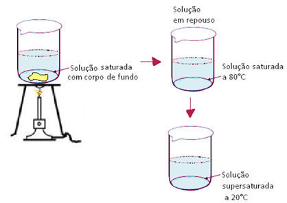 Por exemplo, se pegarmos a solução saturada com corpo de fundo, citada anteriormente, que possui 36g de sal dissolvidos e 14 g no corpo de fundo, e a aquecermos, notaremos que os 14 g que estavam precipitados irão se dissolver. Isso acontece porque com o aumento da temperatura o coeficiente de solubilidade, nesse e na maioria dos casos, também aumenta. Posteriormente, deixamos essa solução em repouso para que volte à temperatura inicial, que era de 20°C. Ao fazermos isso, os 50g continuam dissolvidos na água. Desse modo, haverá mais soluto dissolvido (50g) do que deveria ter (36g) naquela temperatura e pressão. É, portanto, um caso de solução supersaturada
