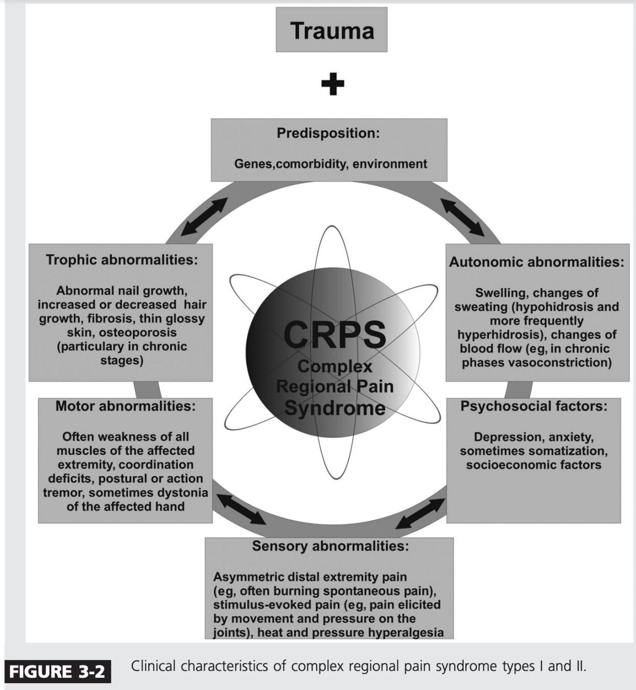 - Dor espontanea, alodinia, hiperalgesia, edema, alterações autonômicas e alterações tróficas