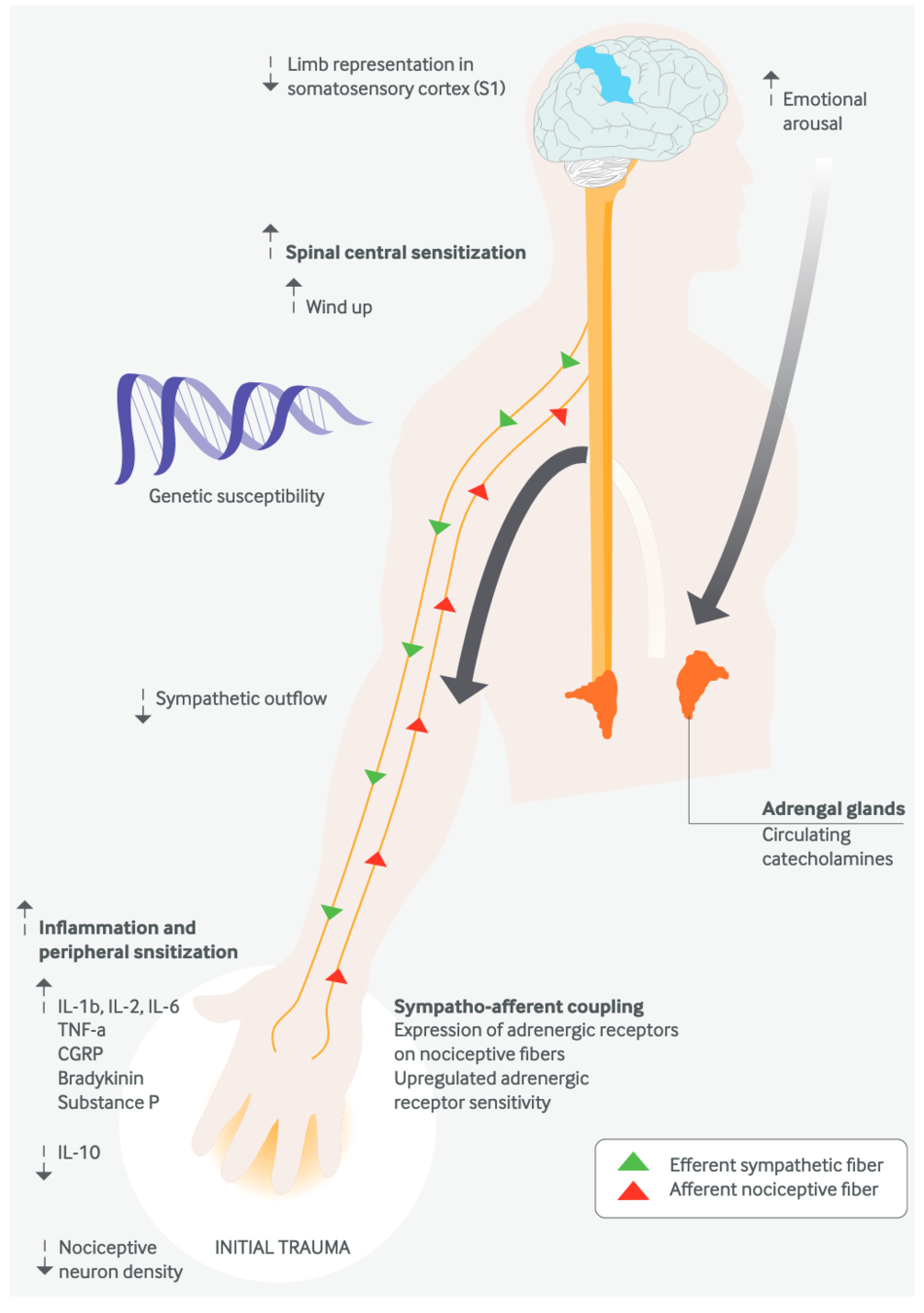 - Alterações autonômicas são importantes para o diagnóstico - edema, fase aguda eritema e hipertermia e em fase cronica membro frio.