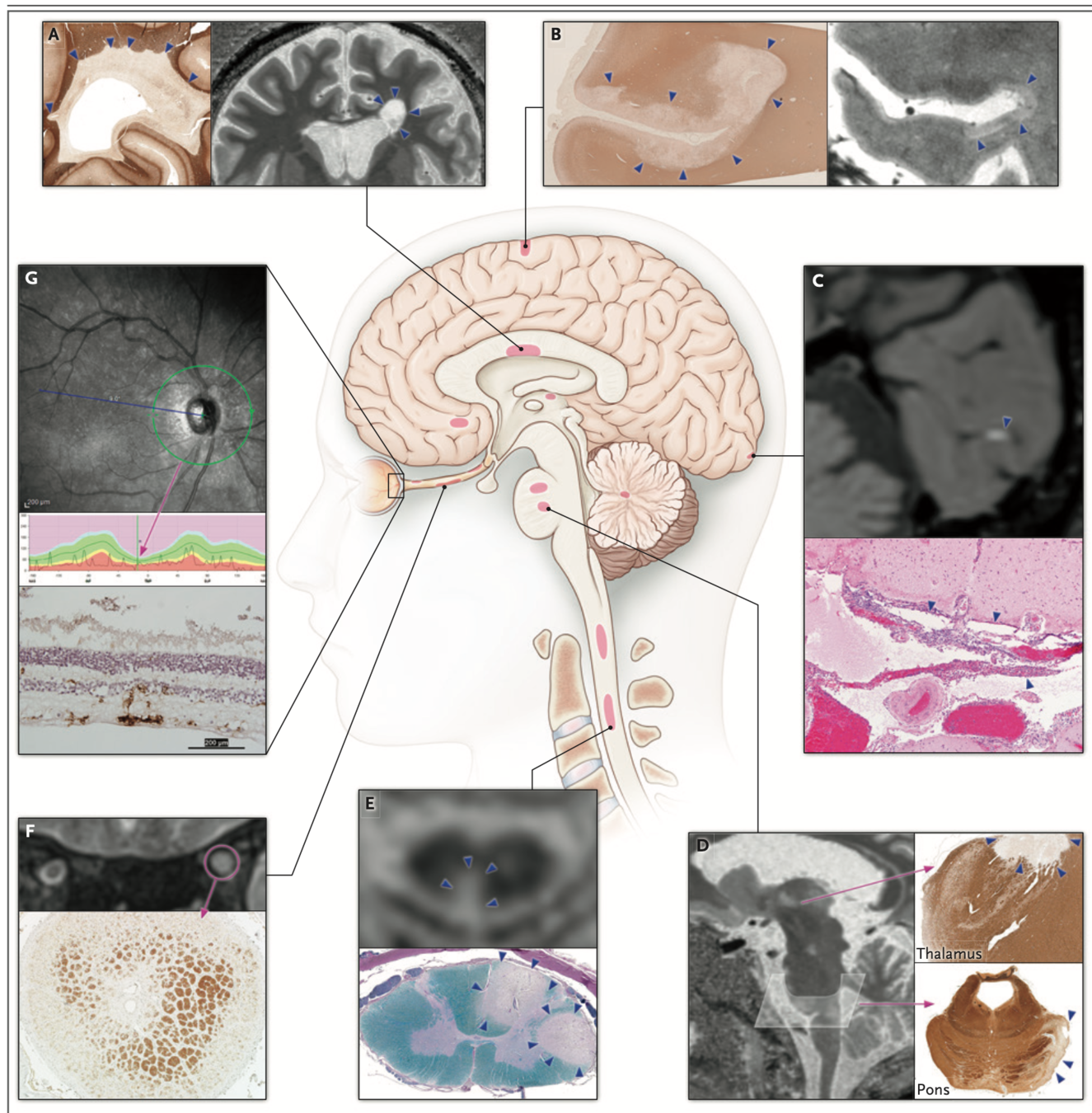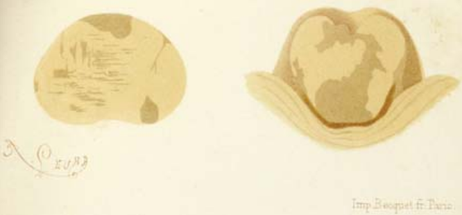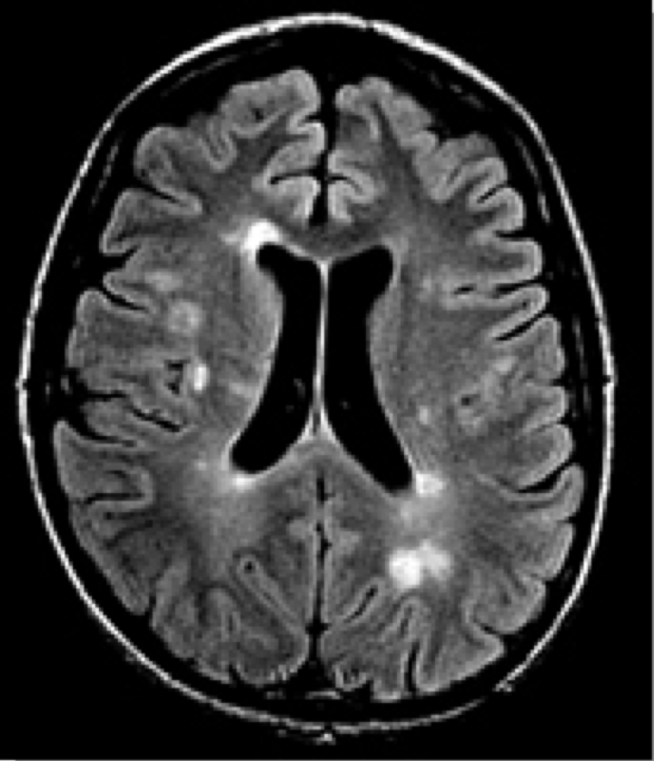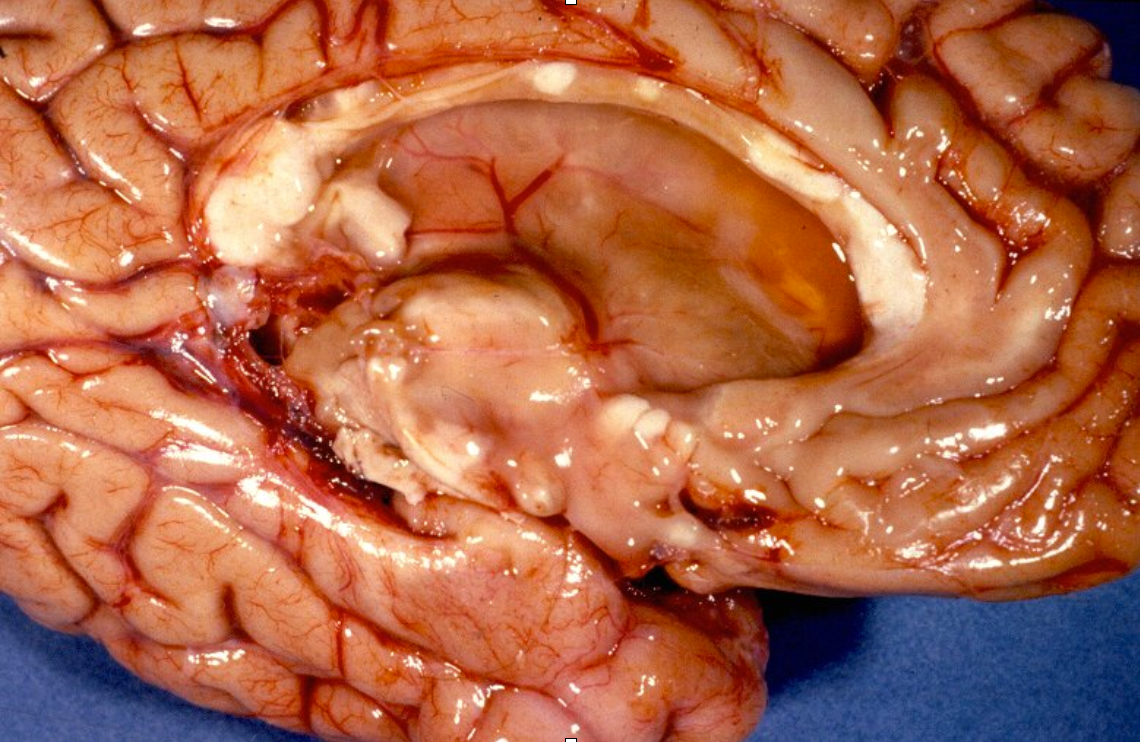 - Durante os trabalhos de dissecção de cadáveres foi descrito cicatrizes vistas como massas pálidas no tecido cerebral.