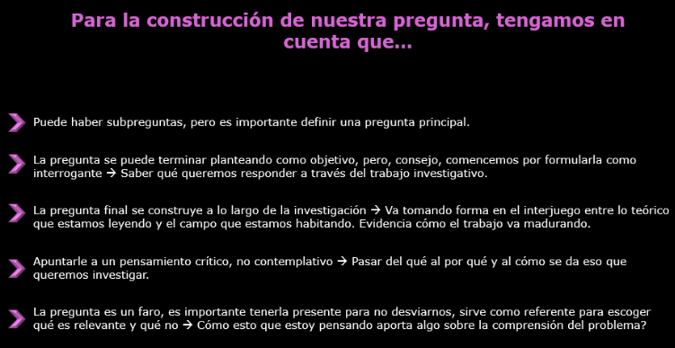 Importante: que sea viable. Para ello hay que acotar la pregunta: grupo, espacio, tiempo, con el que se trabajará.
