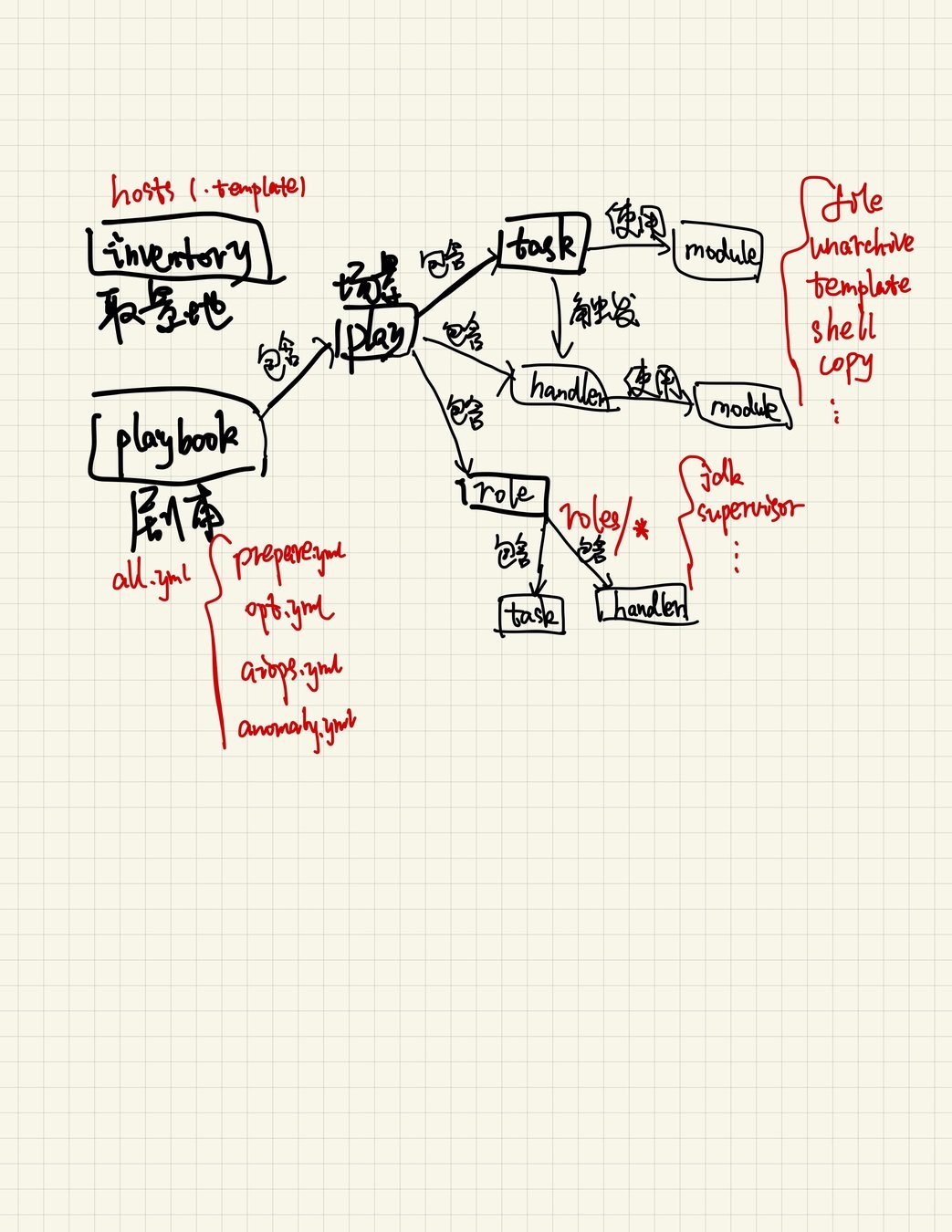 命令(Ad-Hoc Commands): ansible <host-pattern> [options] ansible all -m ping ansible all -m shell -a "supervisorctl status" 脚本(Playbook): ansible-playbook <playbook-name> [options] ansible-playbook all.yml -i hosts