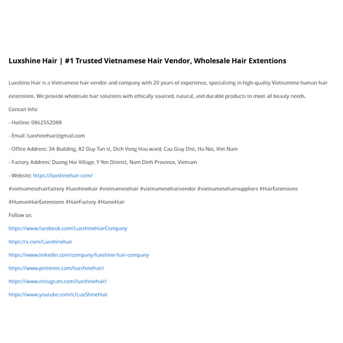 Luxshine Hair - Vietnamese hair vendor and company specializing in Virgin human hair extensions, ethically sourced, high-quality, durable, and wholesale. Location: Hanoi, Vietnam Phone: 0862552088 Website: https://luxshinehair.com/