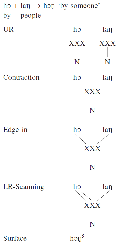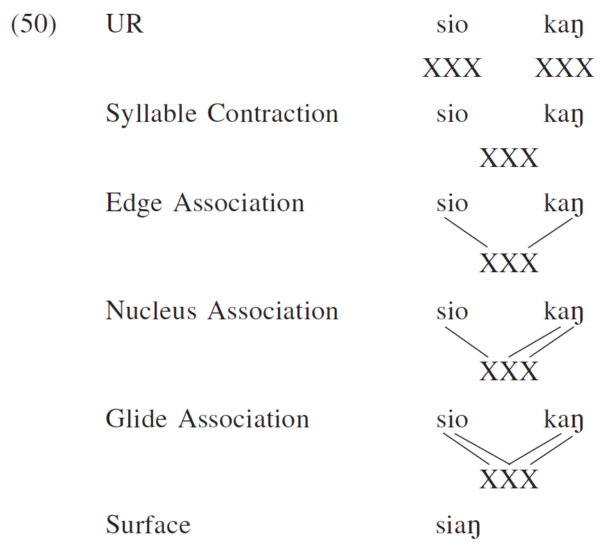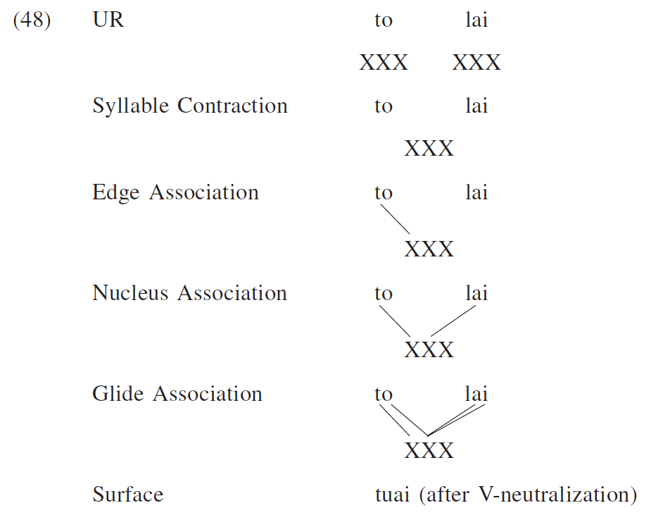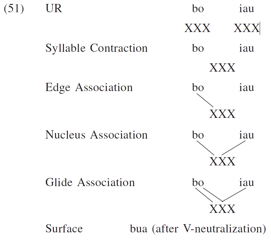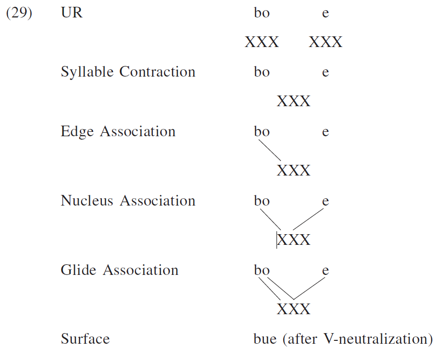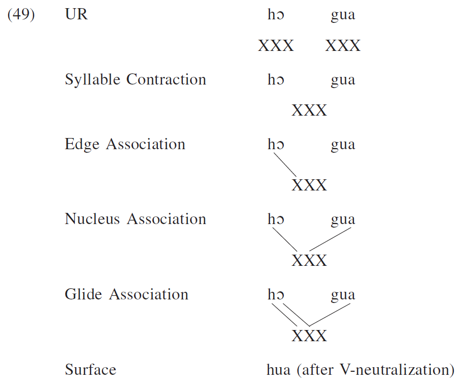 An important phonological process in syllable contraction is V-neutralization, by which mid vowels become high when they form rimes(韻基) with the following vowels, evidenced in (7). Notice that V-neutralization does not affect (5) since it would otherwise create *huaŋ, which violates the Branching-N Constraint (Chung 1996, p. 72).