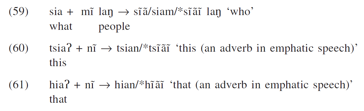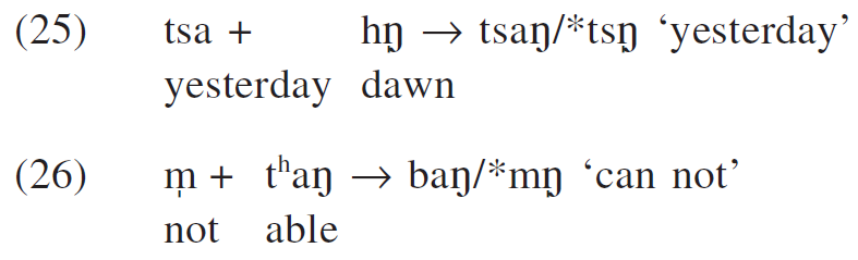 Though they are [+syllabic], the nucleus position is never their docking site in syllable contraction. The reason lies in that nasals have less sonority than vowels. In (26) the voiced output onset results from a co-occurrence restriction that nasals cannot precede oral vowels in Taiwanese Southern Min.