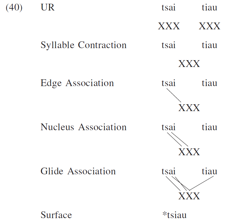 V-neutralization and Phonotactic(音位) Constraints are adopted here. Nonetheless, the Glide Constraint is abandoned since Vocoid Syllabification(元音音節化) together with Vocoid Association takes care of relevant matters. Last, the No Crossing Line Constraint, the Non-identity Constraint, and Glide Transfer are added in the sonority model to accommodate more data.