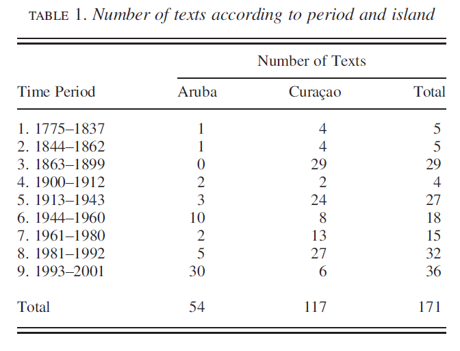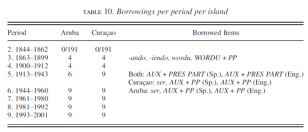 - Time period 1 (1775–1837): reflects precontact Papiamentu when borrowings were not expected.