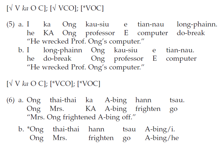 It has been observed that ka can introduce many different thematic roles in a pre-verbal position.