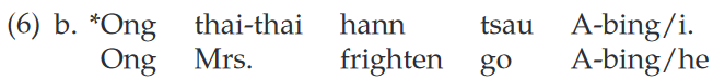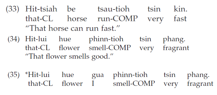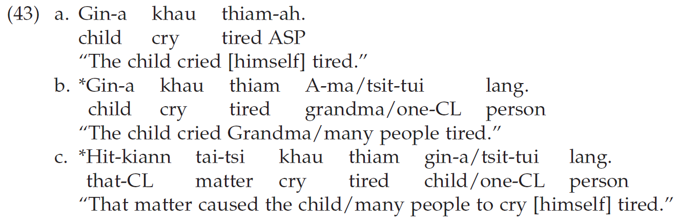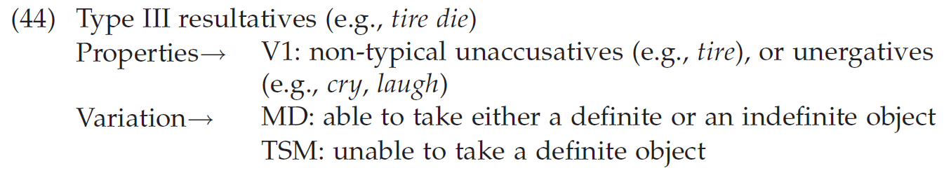 TSM also has pure unaccusatives (or inchoative), which do not demonstrate a causative alternation and can occur with hoo i to denote adversity. This hoo is obligatorily(強制性的) followed by the pronoun i, which is expletive(虛詞) and non-referential.