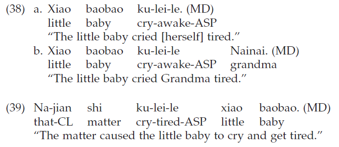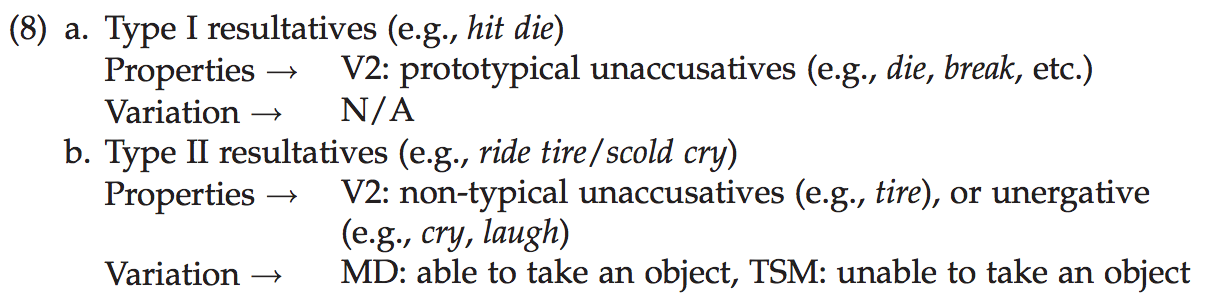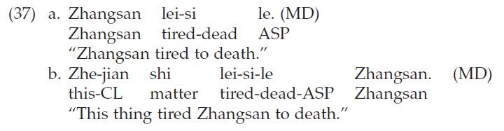 Research in MD shows that two types of causatives involve resultatives(結果式)(e.g., C.-T. Huang 2006).