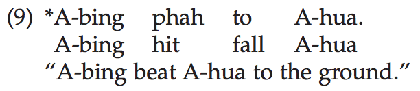 The dative construction in (46c) and the serial verb construction (SVC) in (46d) also involve a causative hoo clause, which predicts on the object in (48) and (49a) or the subject/event argument in (49b).