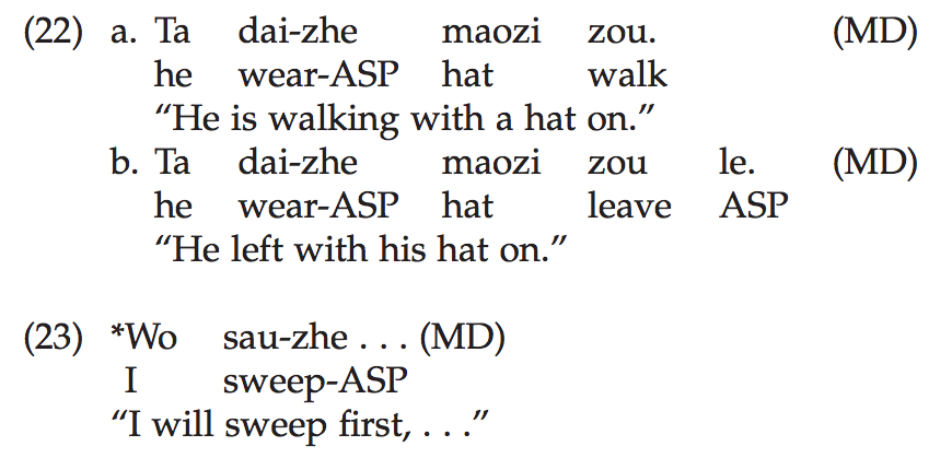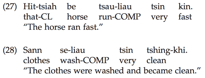 in allowing more verb complexes to be analyzed as compound words and to take post-verbal objects. - TSM employs pre-verbal adverbs, auxiliary verbs, and clause-final particles to encode aspect, while MD mainly uses suffixes for marking aspect. As far as phase markers are concerned, among the three TSM phase markers discussed, that is,