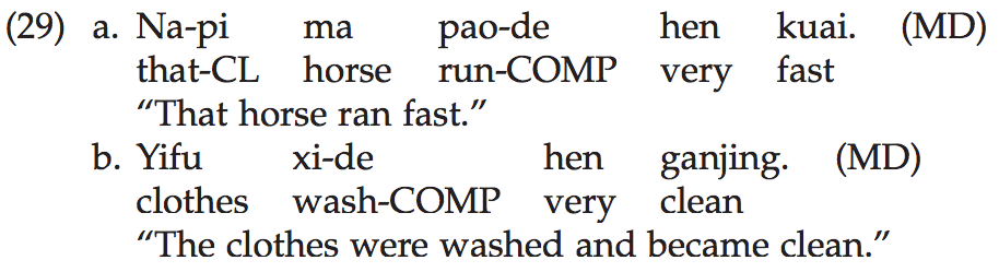 If Wang's analysis were on the right track, there would be variation between TSM and MD for the VCs in (10a,b) because they belong to Type II and the VC in (10c) would be acceptable in both TSM and MD because it is Type I. More research in the future will thus be needed for the analysis of such data.