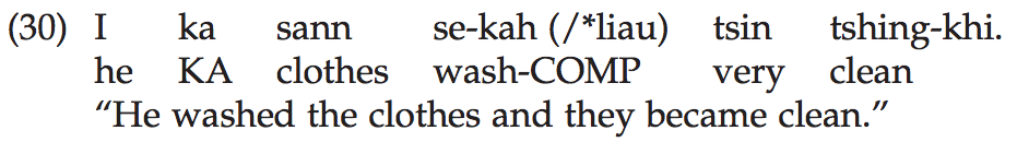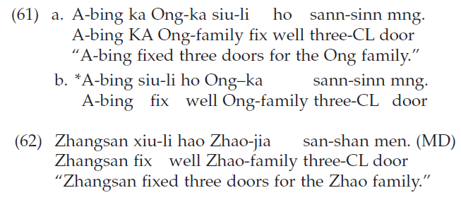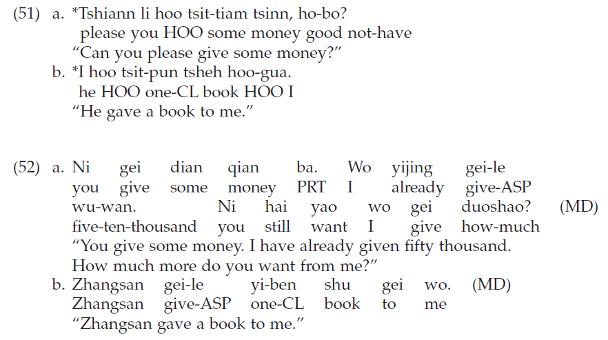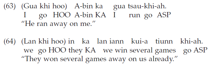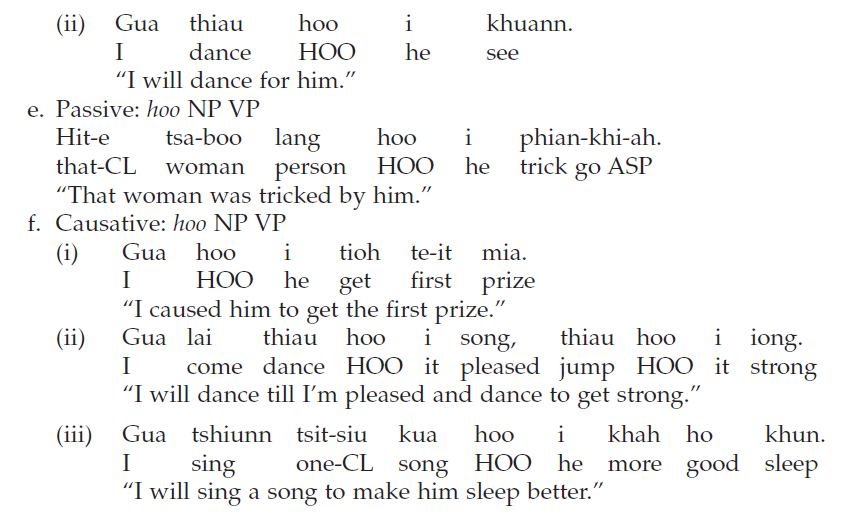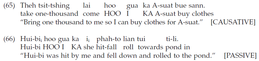 - It is more difficult for TSM to have causatives without overt marking, unlike MD. Also, for a low benefactive applicative construction, TSM has to mark it with an overt marker, that is the benefactive ka, while no overt marking is required for MD. Moreover, hoo i in TSM instead of hoo by itself is grammaticalized.
