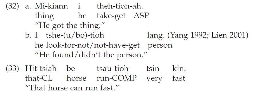 Tioh is the most grammaticalized(語法化) one since it can form a word with a verb and take an object.