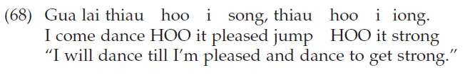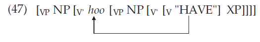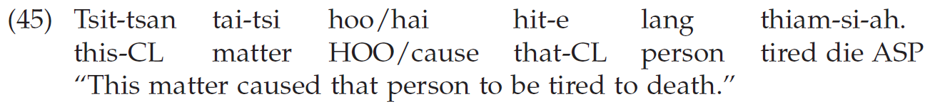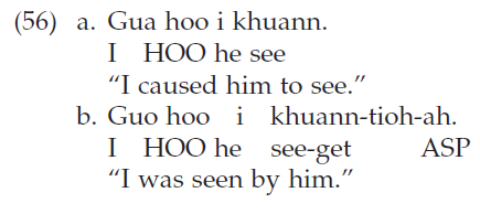 Cheng et al. (1999: 167) show that hoo behaves like a causative verb, unlike its counterpart in MD:
