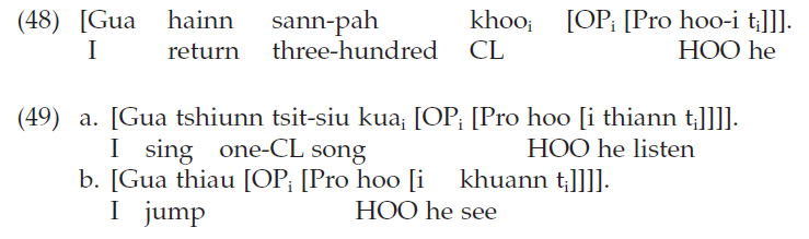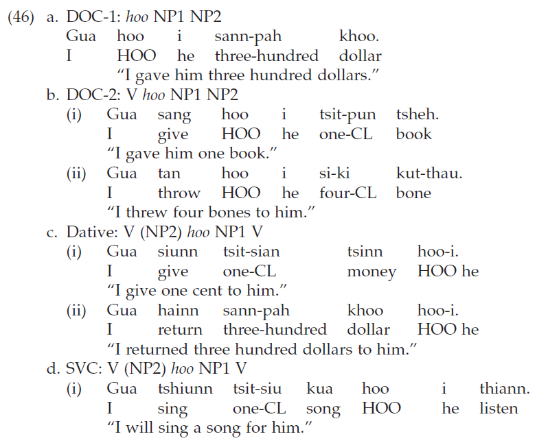 Cheng et al. propose that the two double-object constructions (DOC) in (46a–b) involve a causative hoo. (46bi) means “I caused him to have one book.” In a DOC-2, the embedded “have” can raise and be realized as hoo: