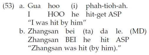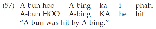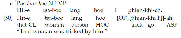 The fact that hoo in the above example has the tone value of the third person singular pronoun, i, supports the analysis that hoo is a contraction(縮合) of hoo plus i and hence a long passive is involved.