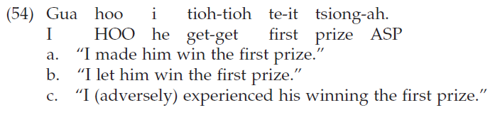 A hoo sentence in (54) can be three-way ambiguous with a strong and weak causative reading (“cause” and “let”) and an adversative passive reading.