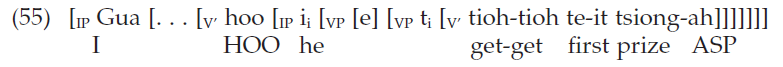 In (55), [e] can be seen as an object of the VP, whose subject has raised to IP.The outermost object undergoes the NOP movement and is co-indexed(同指標) with the subject gua.