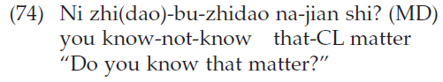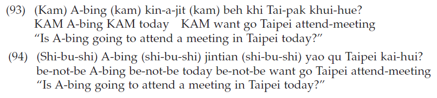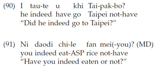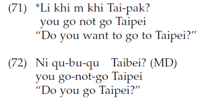 Because of the limited use of the V-not-VP form in TSM, a V-not-VP question in MD is usually translated into a VP-not in TSM, where a negative particle occurs at the sentence-final position. Neg-particles share the same forms with negative markers but receive a neutral tone instead.