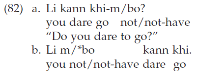 An acceptable V-not-VP form must be m. In addition, m in a V-not-VP form must be non-volitional (非意願), in contrast to the volitional m in (69). In addition to bat and si, only a few verbs can form a V-not-VP question. They include tsai, kann, tioh, bat, ho, thang, khing, and kam-guan, which do not seem to form a natural class(自然詞類?) in any way.