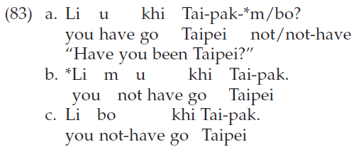 While the neg-particles in MD respect the agreement between the negative marker and verb/aspect, not all the neg-particles in TSM do. For example, while m observes the agreement, bo seems to be freer (with some exceptions such as si, Audrey Li, pers. comm.).