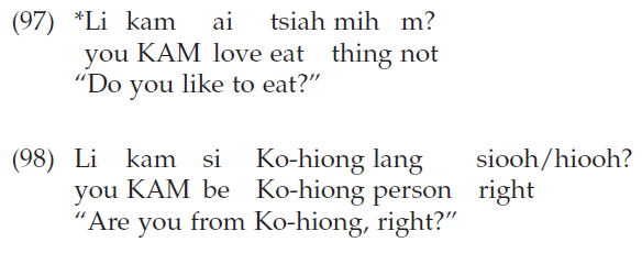 Kam is the form closest to the yes–no question marker ma(MD), which is modality-free and can mark a rhetorical question(反問句).