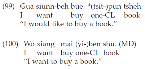 Cheng and Sybesma (2005) argue that classifier languages, having no indefinite article(冠詞), derive their indefinites based on definites, with the latter involving a Classifier Phrase and the former a Numeral Phrase on top of the Classifier Phrase. If this analysis is on the right track, this means the distinction between definites and indefinites has to be overtly marked in TSM when a classifier is involved.