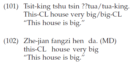 - In TSM, the numeral “one” can never be omitted, but the deletion is possible in MD when it occurs in an indefinite NP. Also, some adjectives in TSM, not in MD, require the presence of a classifier for marking dimension. Moreover, unlike MD, TSM allows two modifier markers to occur together.