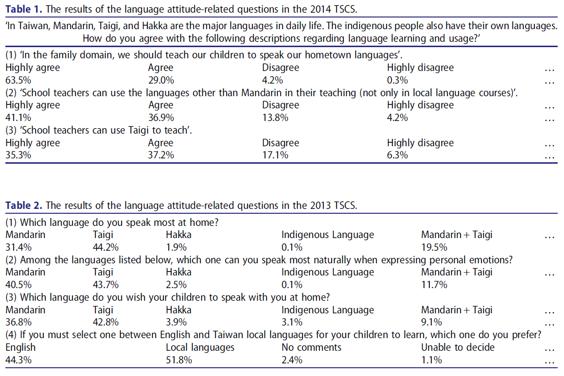 Chen's (2007) language vitality survey indicated that Taiwanese local languages, including Taigi, remained shifted and that the implementation of the Taiwanese local languages courses in elementary school did not boost the stagnant intergenerational transmission of these languages, including, of course, Taigi. The results of the Taiwan Social Change Survey (TSCS) indicated a similar 'activeattitude, passive-performance' situation.