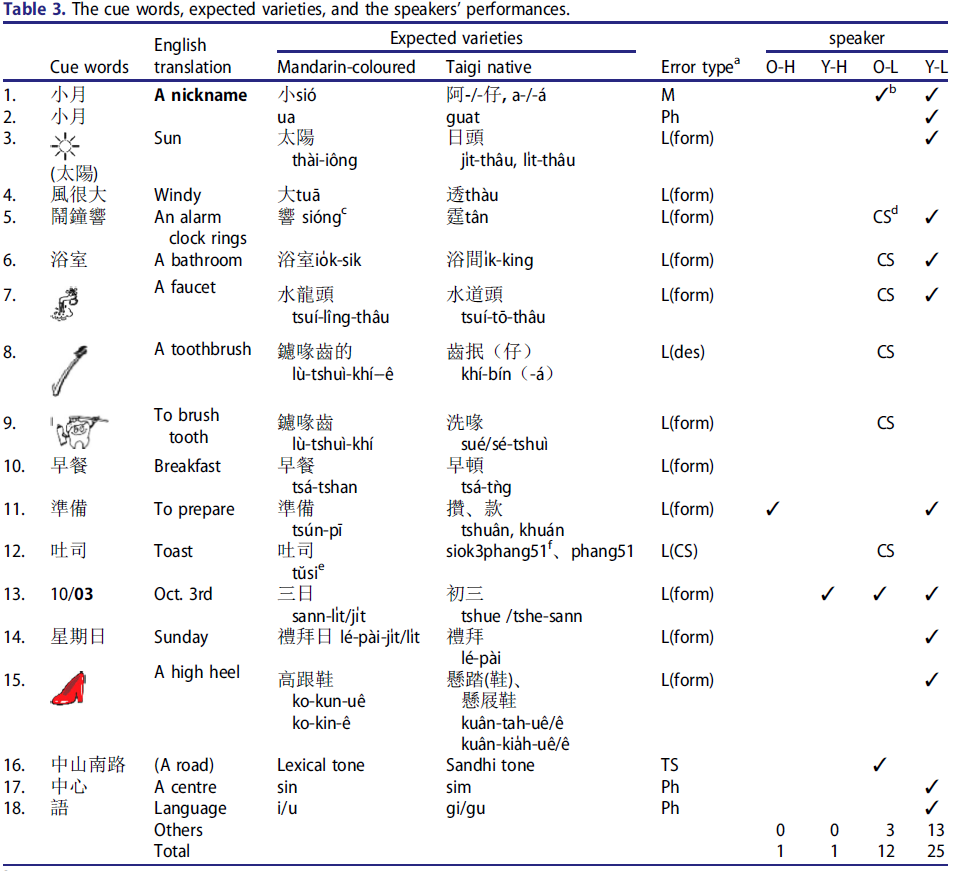 請speakers看圖講故事,佇邊仔有華語提示一寡詞,遮的詞就是主要欲看的部分,而且有避免掉挹僻(iap-phiah)的詞,因為這是愛看日常的語詞爾。這个研究的假設,是認為若是掌握度愈低,就愈會受著華語的影響,出現發音、詞法、形態、變調的問題。