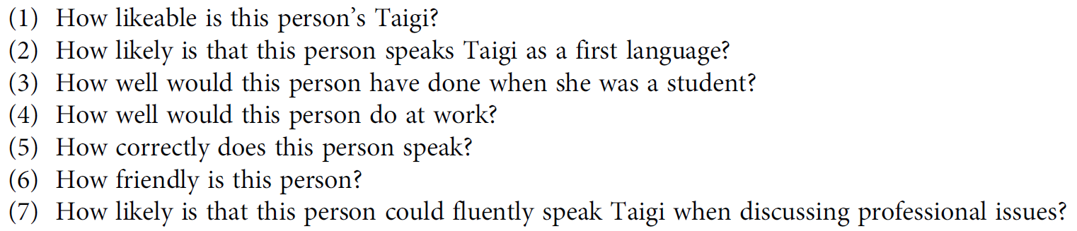 - 臺灣話hông對足濟面向污名化:1976年,研究表示一般人感覺華語較有受過較好的教育、較優越、較少年嘛較有活力;臺灣語的感覺是較有禮貌佮較友善。1986年的研究,發現的是一般人認為華語者較有能力、較文雅閣較現代,閣認為華語是一个較適合佇公共場所使用的語言。