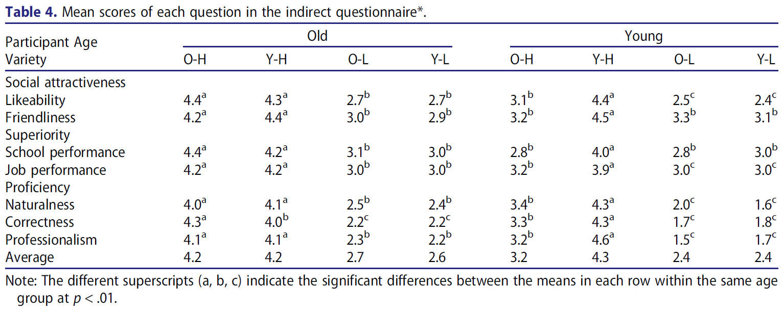 Old group對兩个H的評分攏明顯比兩个L懸足濟;Young group的評分就看會出四位speaker的分法是'Young-H > Old-H > Old-L, Young-L'