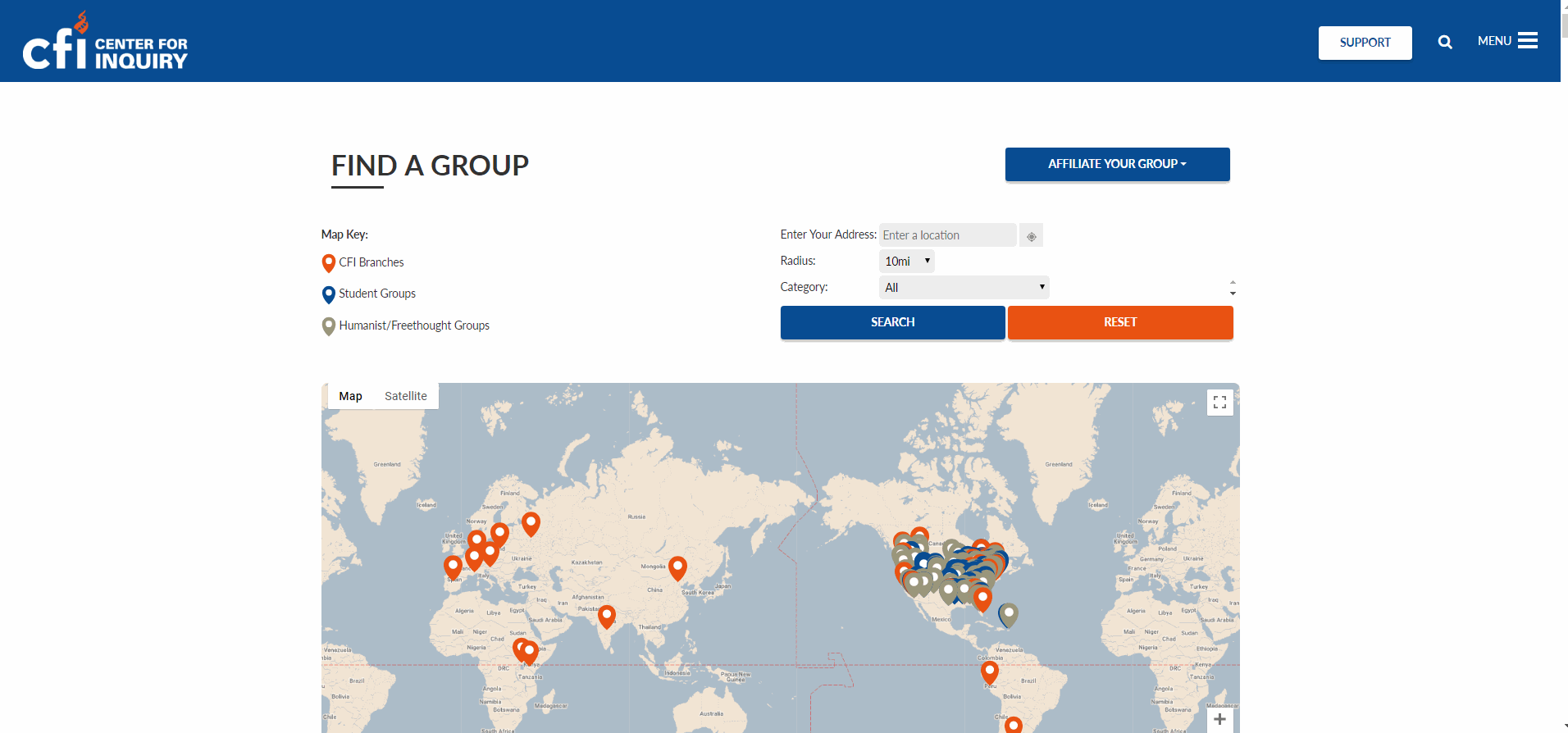 The Find a Group page uses CFI's dynamic location map that shows a comprehensive list of CFI Branches, freethought, atheist, and student groups near you.