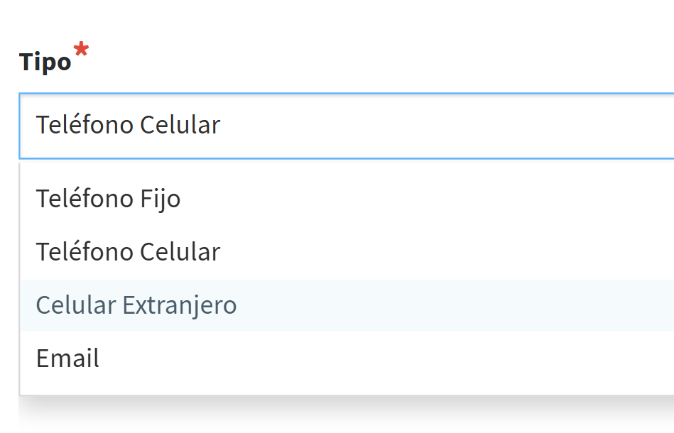 Se agregó una nueva opción en el select de tipo de contacto: “Teléfono extranjero”.