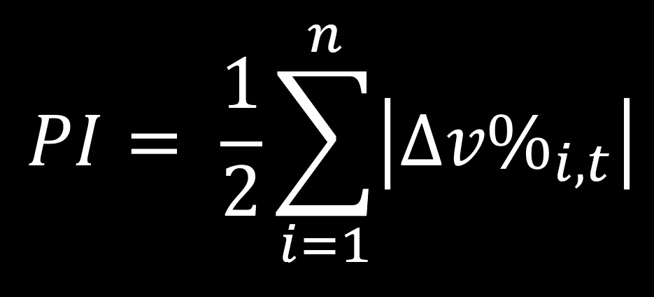 Gdzie pi%j oznacza udział głosów oddanych na listę ugrupowania i w powiecie j w odniesieniu do zbioru wszystkich głosów oddanych na listy tego ugrupowania. Δpi%j,t stanowi różnicę między wartością pi%j w kolejnych dwóch elekcjach.