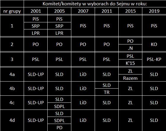 Dla grupy 4a (przejęcie elektoratu SLD przez Razem w roku 2015 i późniejsze wchłonięcie elektoratu Razem przez SLD-Lewicę w roku 2019):