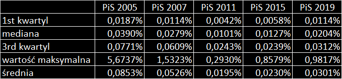 Porównanie rozkładu Δpi%j,t dla PiS/PiS-ZP 2005-2019
