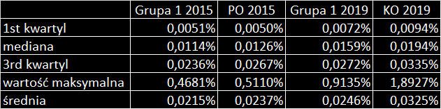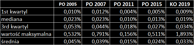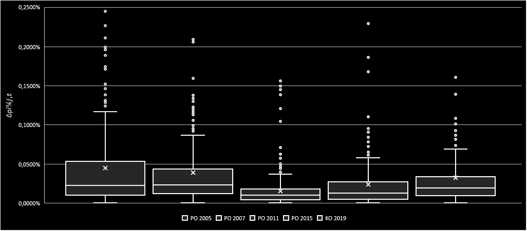Porównanie rozkładu Δpi%j,t dla PO/KO 2005-2019