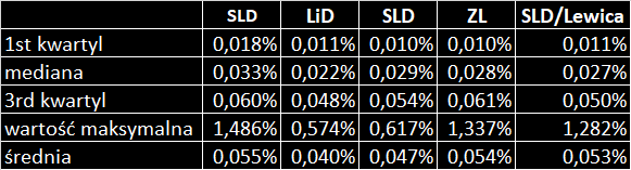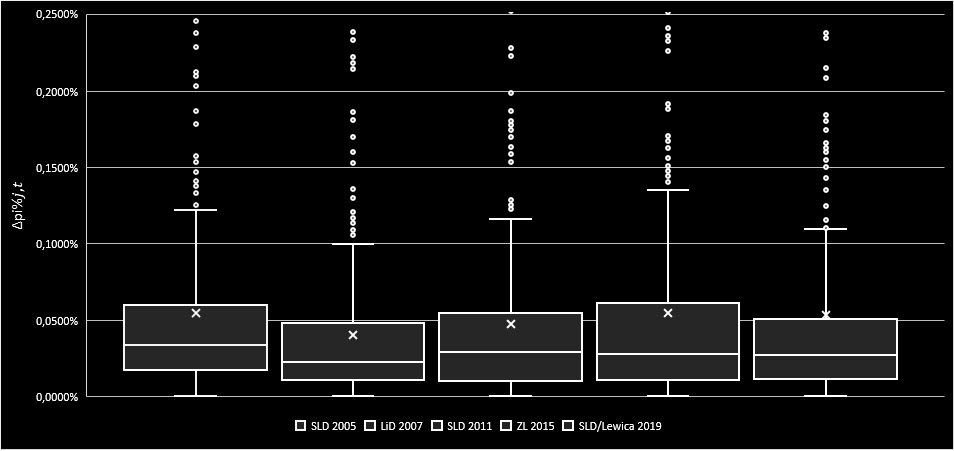 Porównanie rozkładu Δpi%j,t dla SLD/SLD-UP/LiD/ZL/SLD-Lewica2005-2019