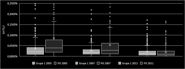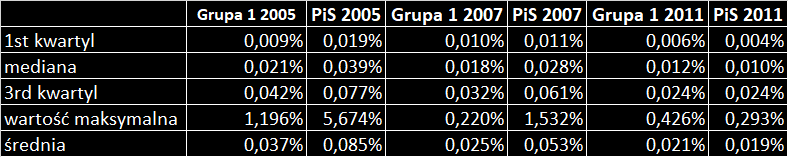Porównanie rozkładu Δpi%j,t dla Grupy 1 i PiS 2005-2011