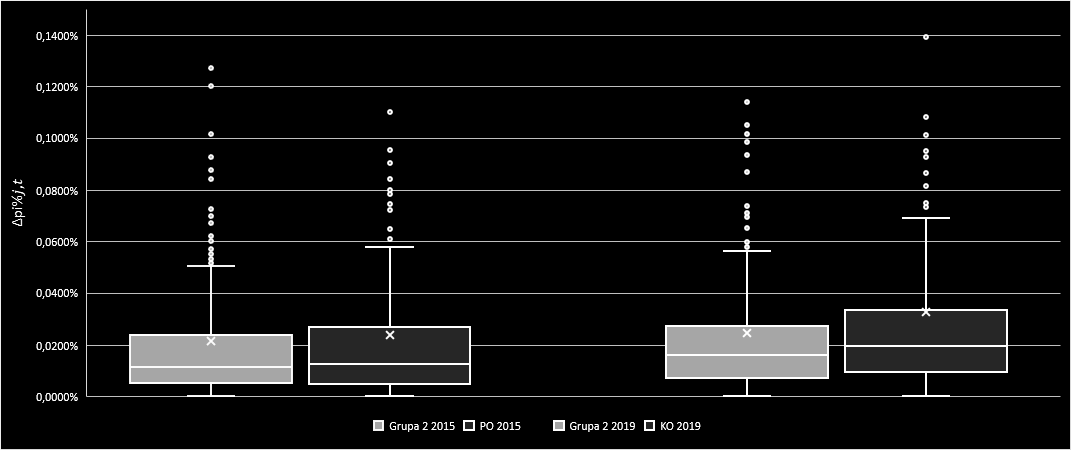 Porównanie rozkładu Δpi%j,t dla Grupy 2 i PO 2015-2019